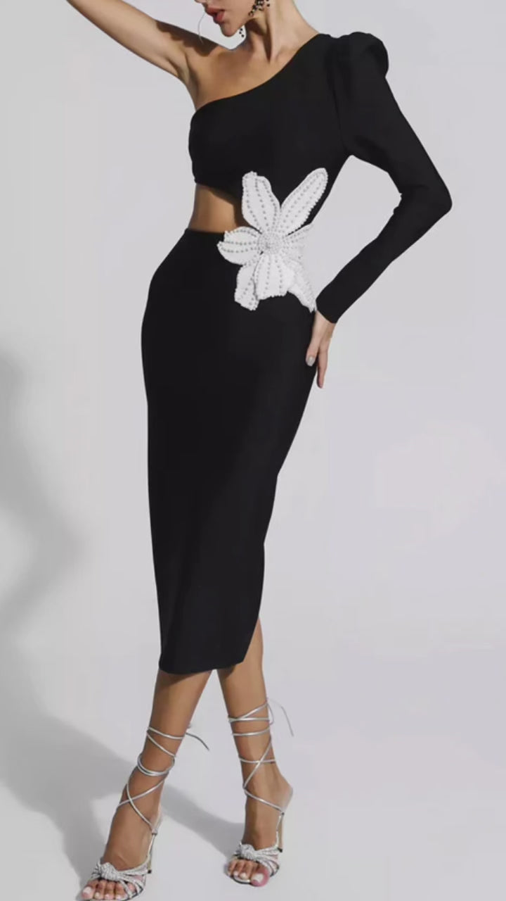 Impresionante vestido de un solo hombro. El vestido Camelia está decorado con una gran y llamativa flor blanca en la cintura y presenta sensuales aberturas. Consulta la tabla de tallas a continuación para seleccionar la talla adecuada.