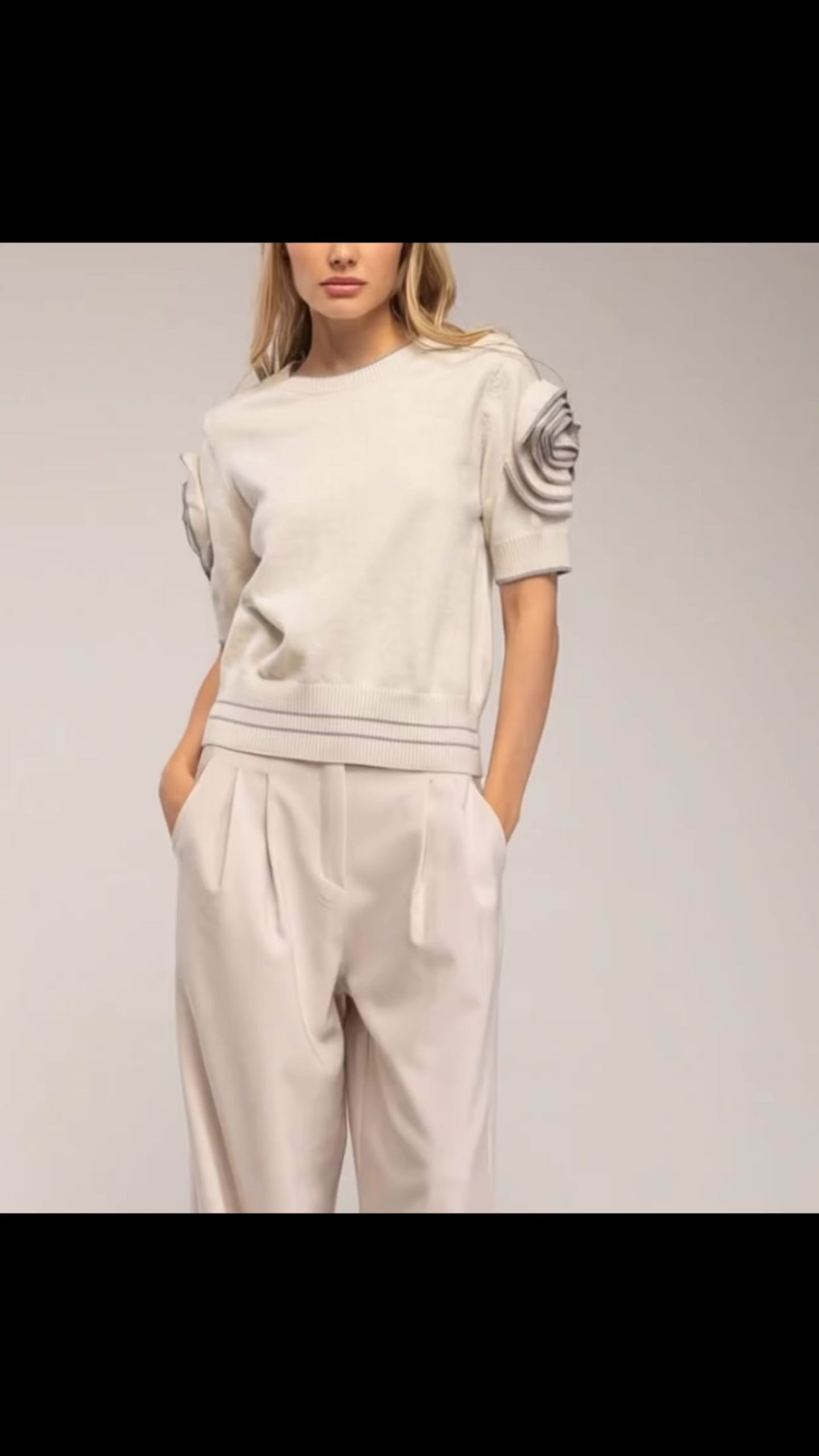 The Florisse knit top stands out for its feminine charm and understated elegance. Floral appliqués on the sleeves and fine contrast trims bring a modern yet romantic touch. Its soft texture and relaxed silhouette make it a versatile piece for day-to-evening styling.