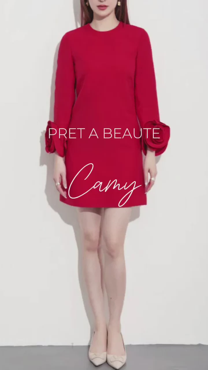 Impressive red mini dress. The Camy dress has a round neckline, long sleeves and is decorated with two large flowers on the sleeves. Please refer to the size chart below for the correct size selection.