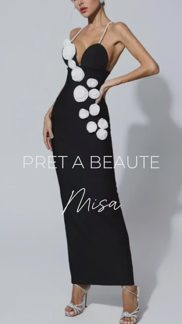 Long dress with thin straps. The Misa dress has thin straps and an open back. Decorated with a striking floral criss-cross pattern on the front. Fastens with a zipper. Consult the size chart below for proper size selection.
